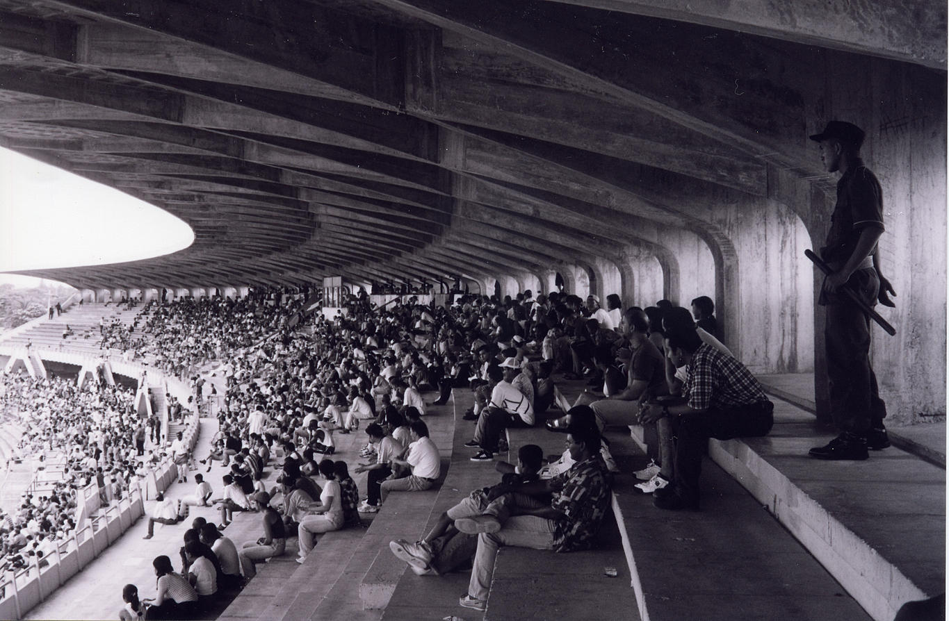 La geometría del estadio es igual en todos los casos. Varía es la concepción de las graderías y su diseño estructural. Las graderías son una superficie curva. El interés arquitectónico de un estadio está en la manera como se combine la estructura de las graderías, la cubierta y el cerramiento; la cubierta, además, debe ser en voladizo. Para salir de la rutina de pórticos, perpendiculares a las graderías, de las cuales hay múltiples variantes, optamos por ensayar una trama de vigas diagonales que se entrecruzan para formar una superficie basada en rombos.